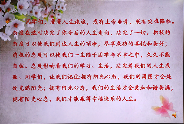 接着杨奕帆、周煜杨两位同学给大家带来了诗朗诵《人生如此多娇》,由此同学们进一步理解了阳光心态对于人生的意义。