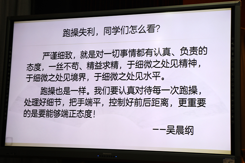 随后,大家围绕跑操比赛展开讨论,就未获流动红旗一事进行了深入探讨,最后,究其原因是不细心。与此同时,同学们得出结论:不管做什么事情,都应该细心、做好细节。