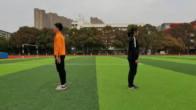 3.跳回地面的时候,先从脚尖落地,膝盖可以微弯,减少冲击力。双脚和双手回到原位。