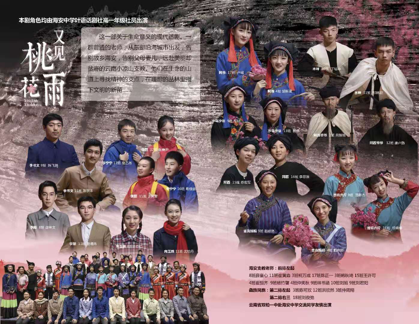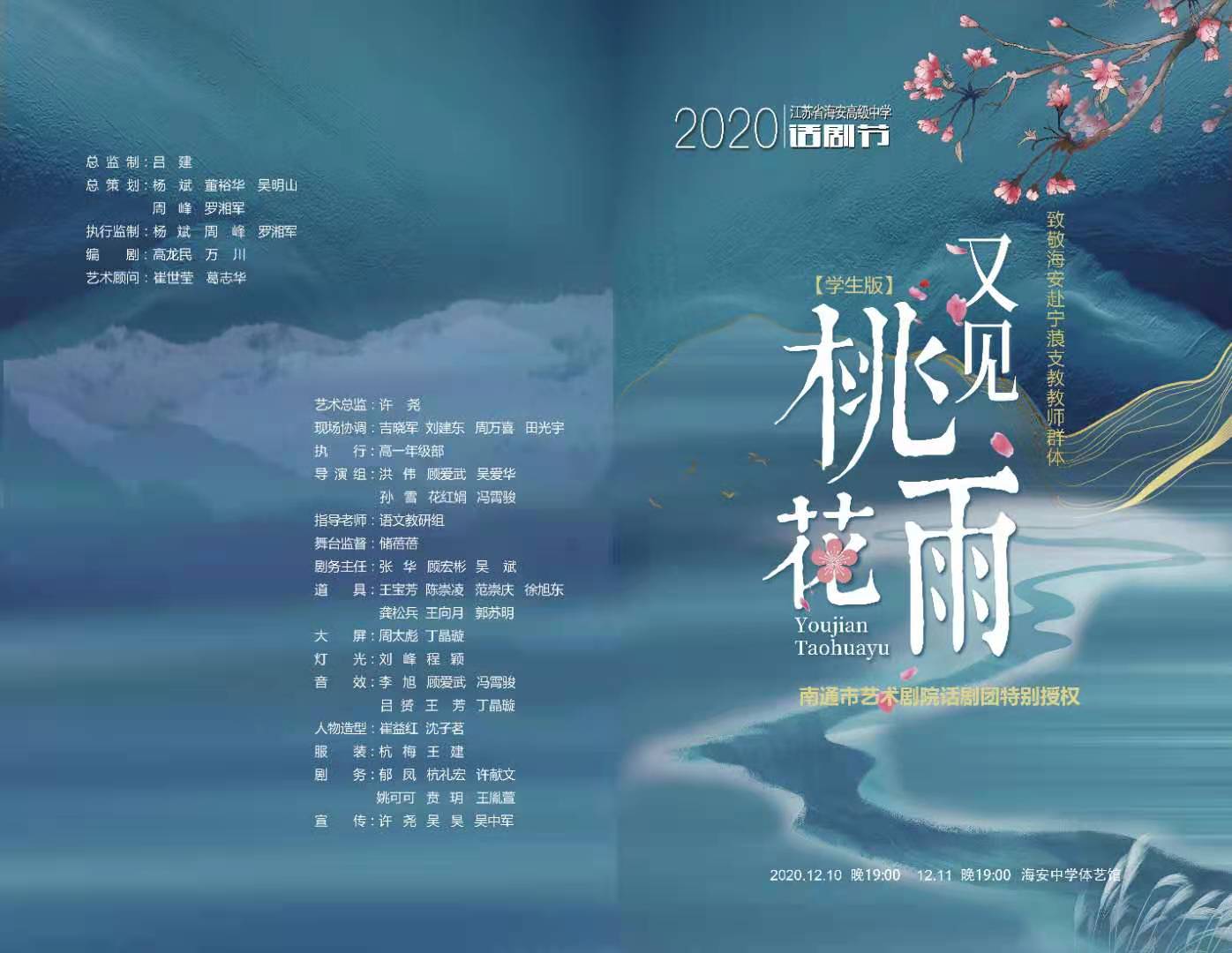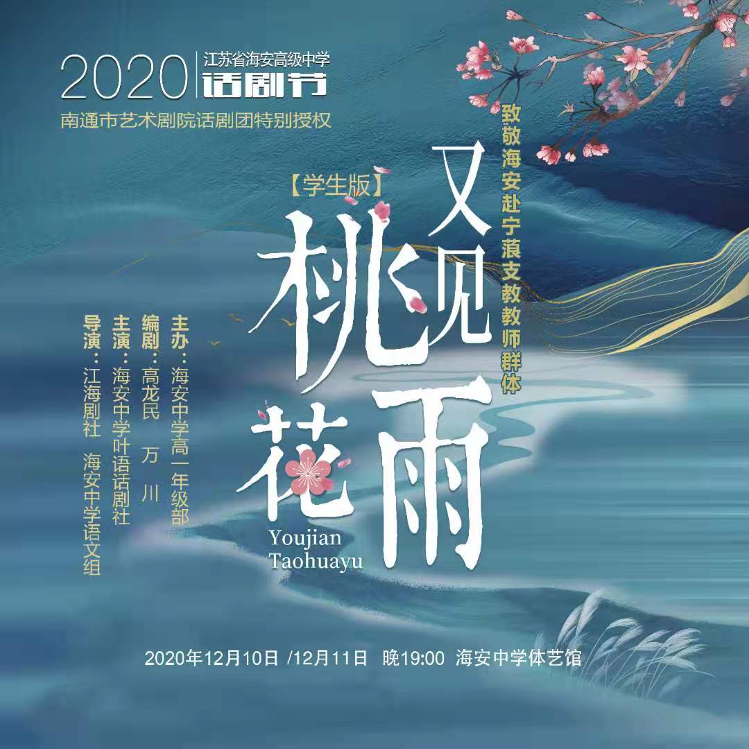 应广大家长朋友和社会各界的强烈要求,为满足广大话剧爱好者与关心海安中学艺术教育的各界人士心愿,海安中学2020年话剧节展演剧目学生版《又见桃花雨》公演时间调整如下: