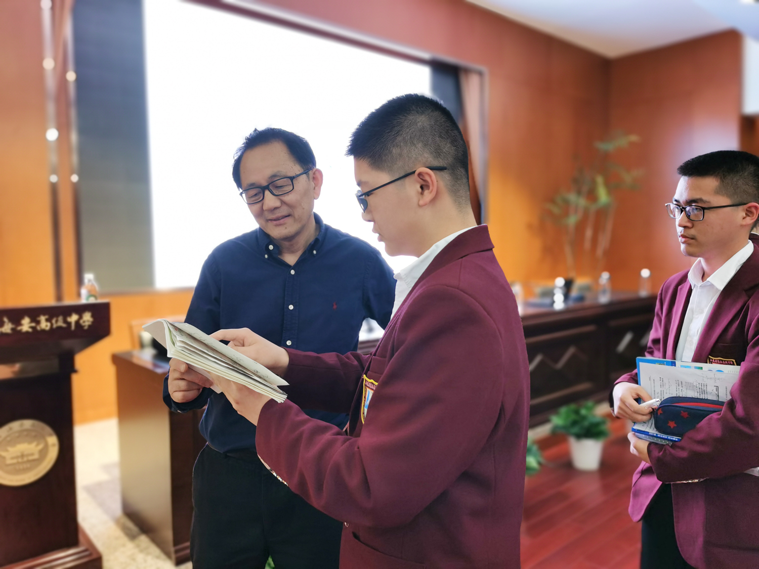 在奥林匹克楼第二会议室,吕建校长与东南大学领导老师就新高考模式下的高中和大学间化学教学与人才培养衔接问题进行了深入的交流。随后,孙岳明书记向吕建校长赠予了在东南大学的海中学子的喜报。