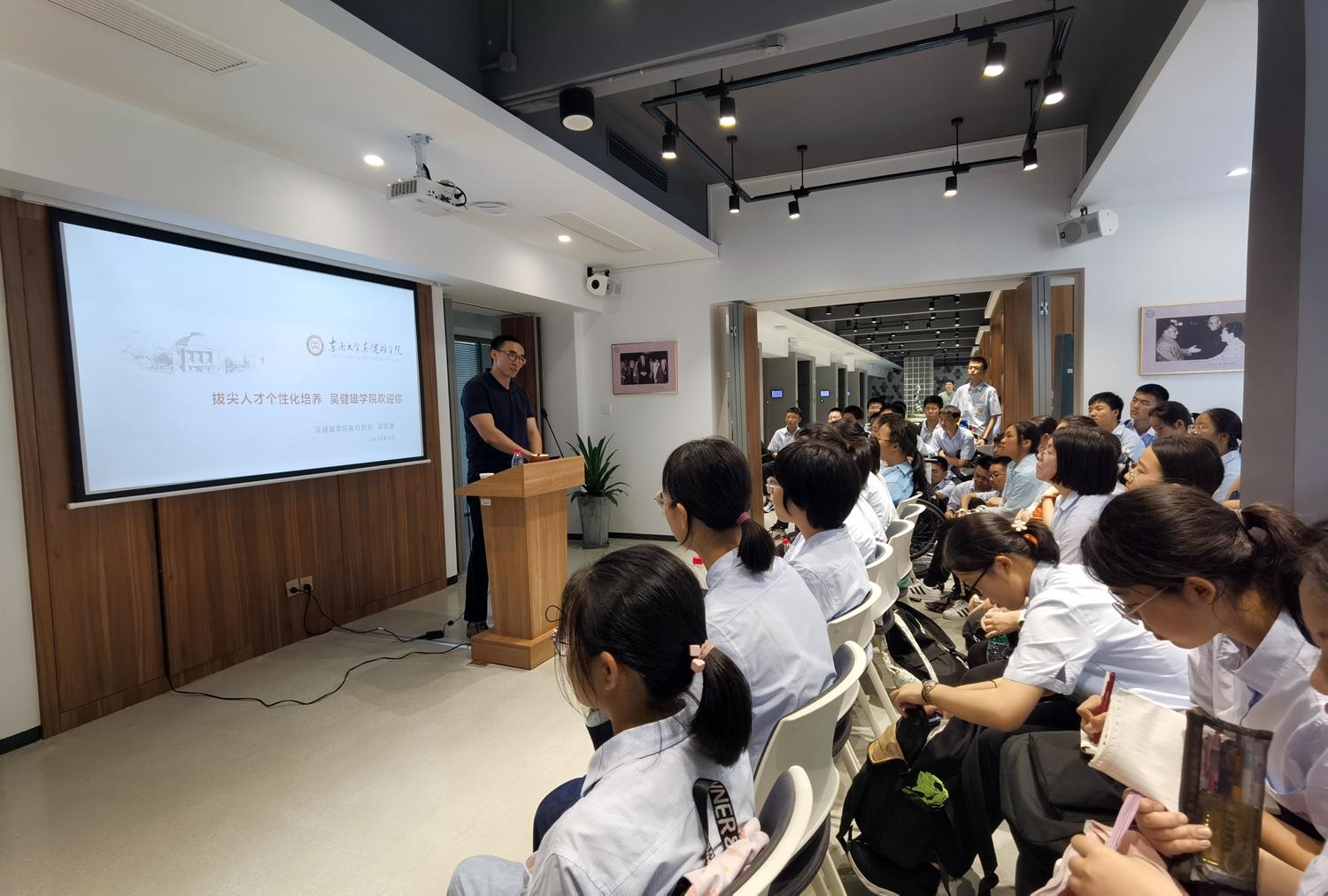 11点,学生们来到健雄书院,他们在这里了解了物理学家吴健雄,一个美丽而睿智的苏州女子,一个热爱科学,为科学奋斗终身的科学家。吴健雄学院执行院长游雨蒙教授用生动诙谐的比喻,用高屋建瓴的评论,帮助大家了解东大特色学科的前沿发展,培养学生的专业兴趣,引领学生的职业规划,让同学们进一步理解高考的真正意义,认知自我的特点,领会职业的价值。