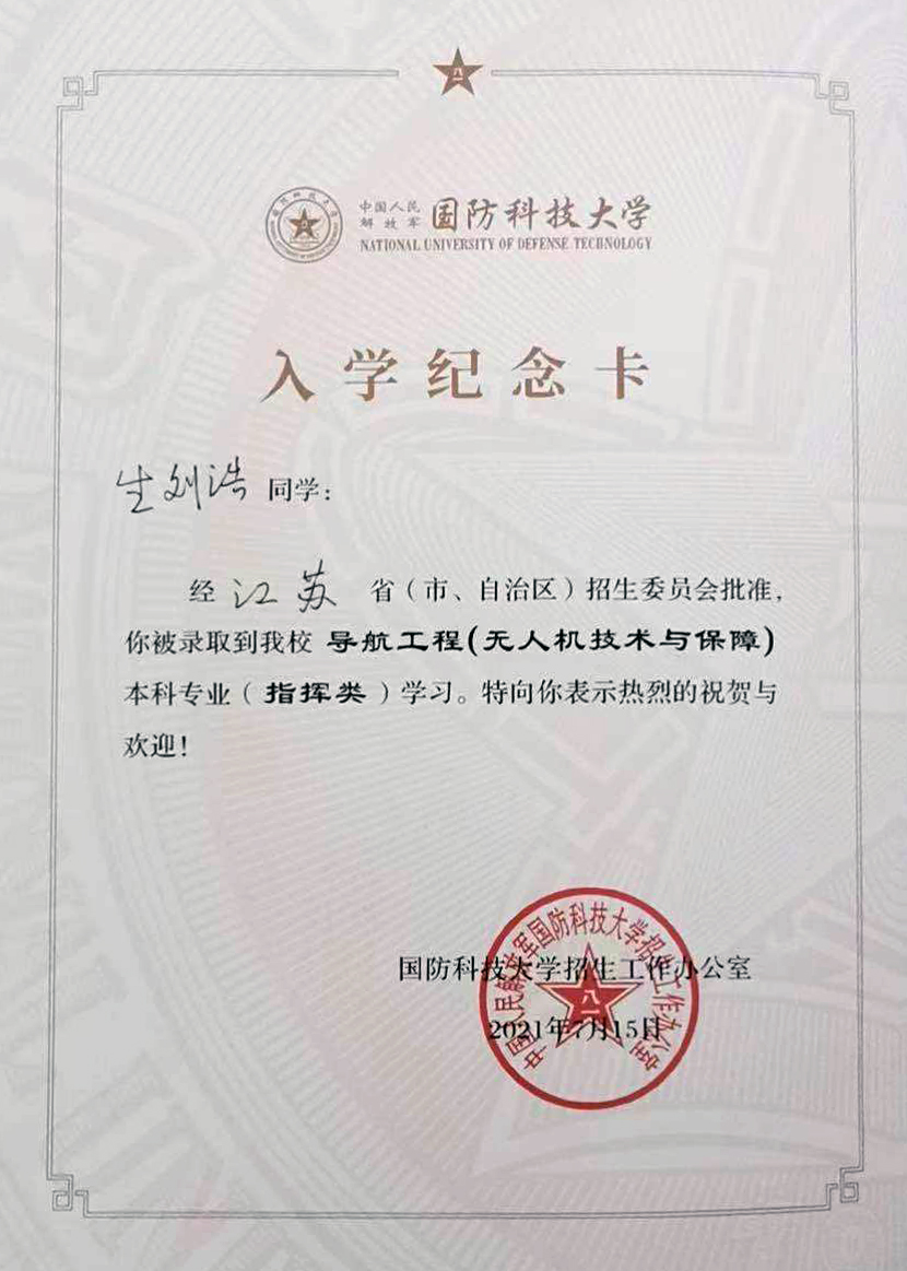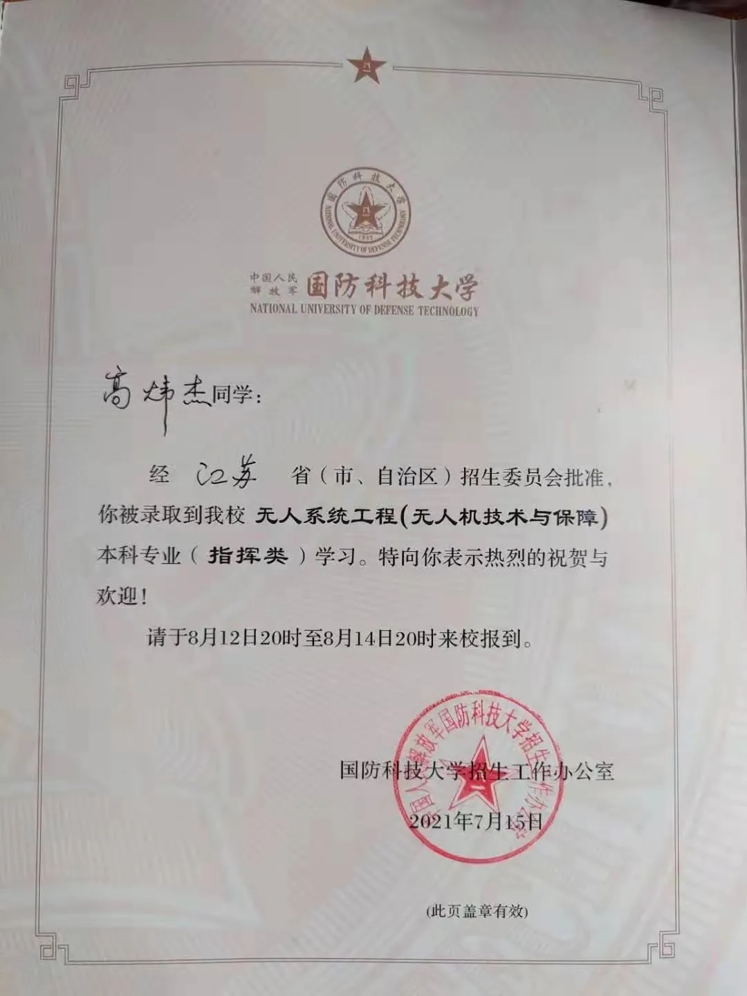 谈及高考志愿及专业选择,高炜杰同学说:“我选的国防科技大学的无人机技术与保障专业。因为我很喜欢物理,这个专业对物理这门学科的要求也比较高。投身国防事业是我一直的梦想,我也一定会更加努力,以后报效祖国。”