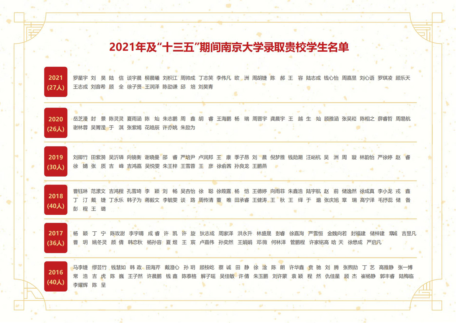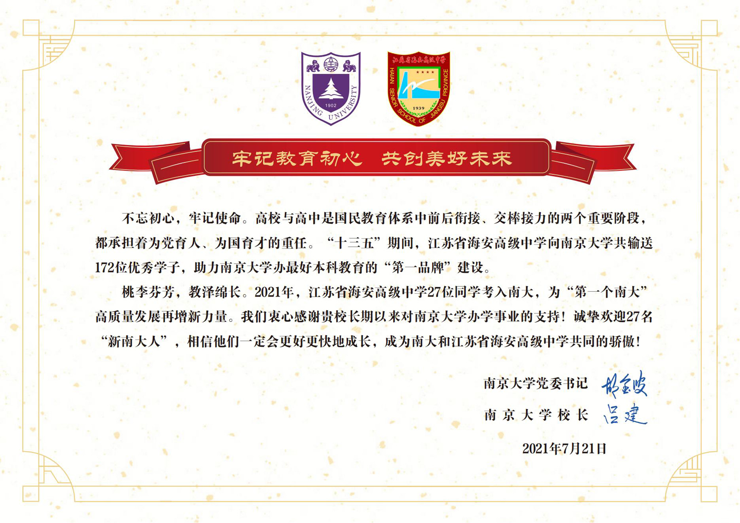 近日,南京大学向我校发来喜报,感谢我校在“十三五”期间向南京大学共输送172位优秀学子,助力南京大学办最好本科教育的“第一品牌”建设。同时祝贺我校2021届27名学子成为“新南大人”,为“第一个南大”高质量发展再增新力量。
