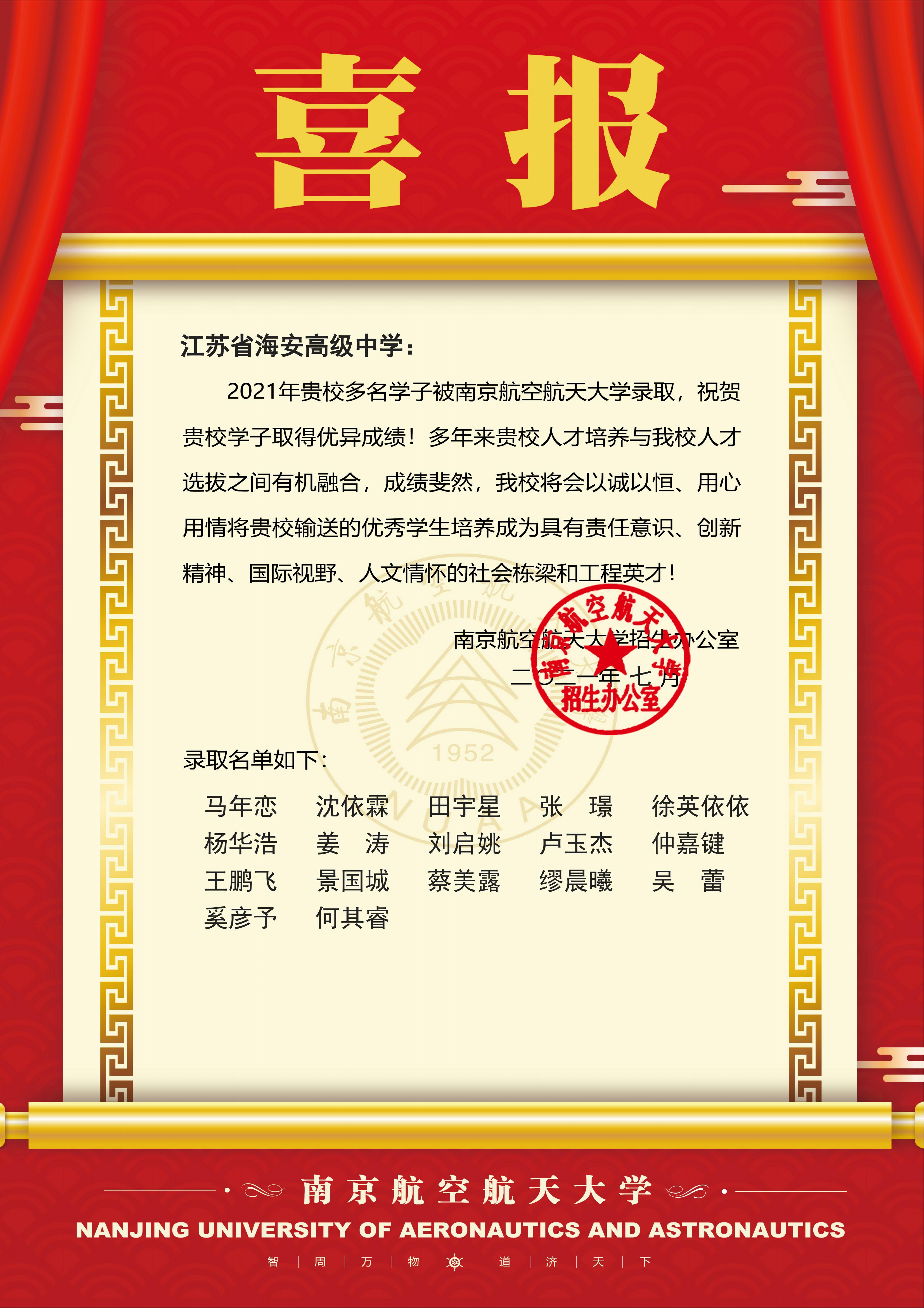 南京航空航天大学向我校发来喜报 来源: 发布时间:2021-07-30 00:00:00 浏览次数: 次 【字体:小 大】 近日,南京航空航天大学向我校发来喜报,祝贺我校2021届17名优秀学子考入南京航空航天大学。同时感谢我校长期以来向南京航空航天大学输送了大批优秀学子,两校间在人才培养与人才选拔间有机融合,成绩斐然。我校是南京航空航天大学的优质生源基地,与南航有着深度的合作,建立了深厚的友谊。宇宙深邃,星汉灿烂。希望同学们埋下信念的种子,承载飞天的梦想,不负时代,踏梦前行,追寻更好的明天! 分享到: 【打印正文】