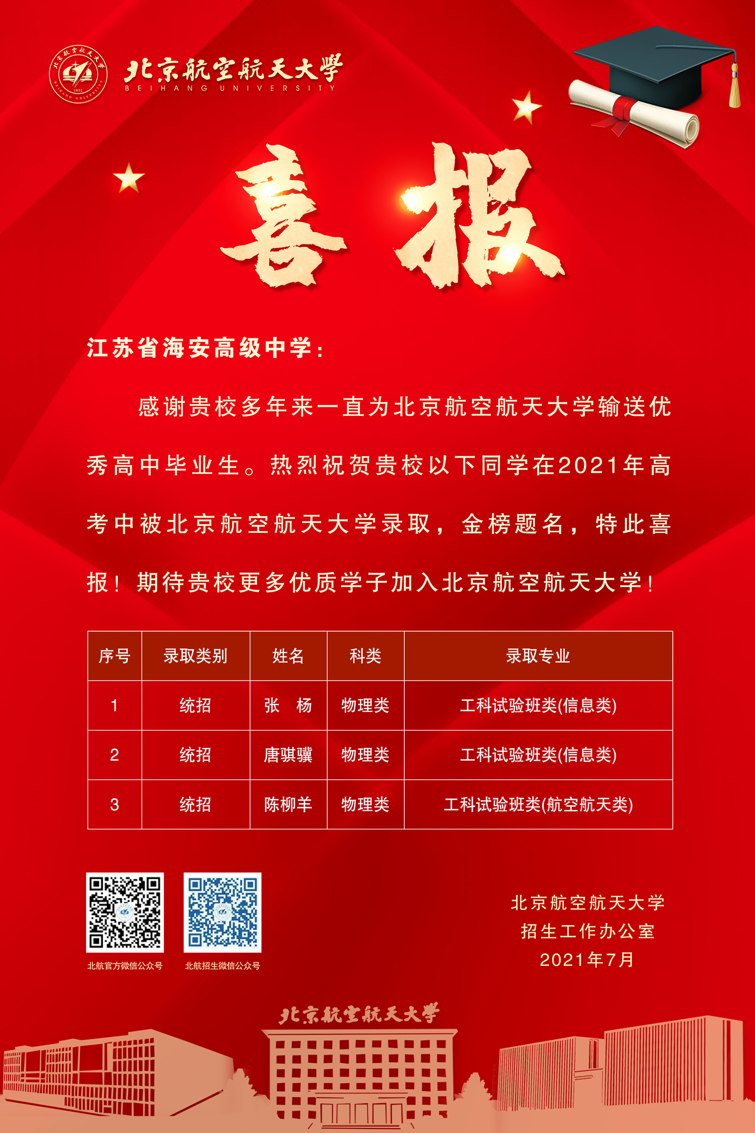 近日,北京航空航天大学向我校发来喜报,祝贺我校2021届3名优秀学子考入北京航空航天大学。同时感谢我校多年来一直为北京航空航天大学输送优秀毕业生,期待我校更多优质学子加入北京航空航天大学。