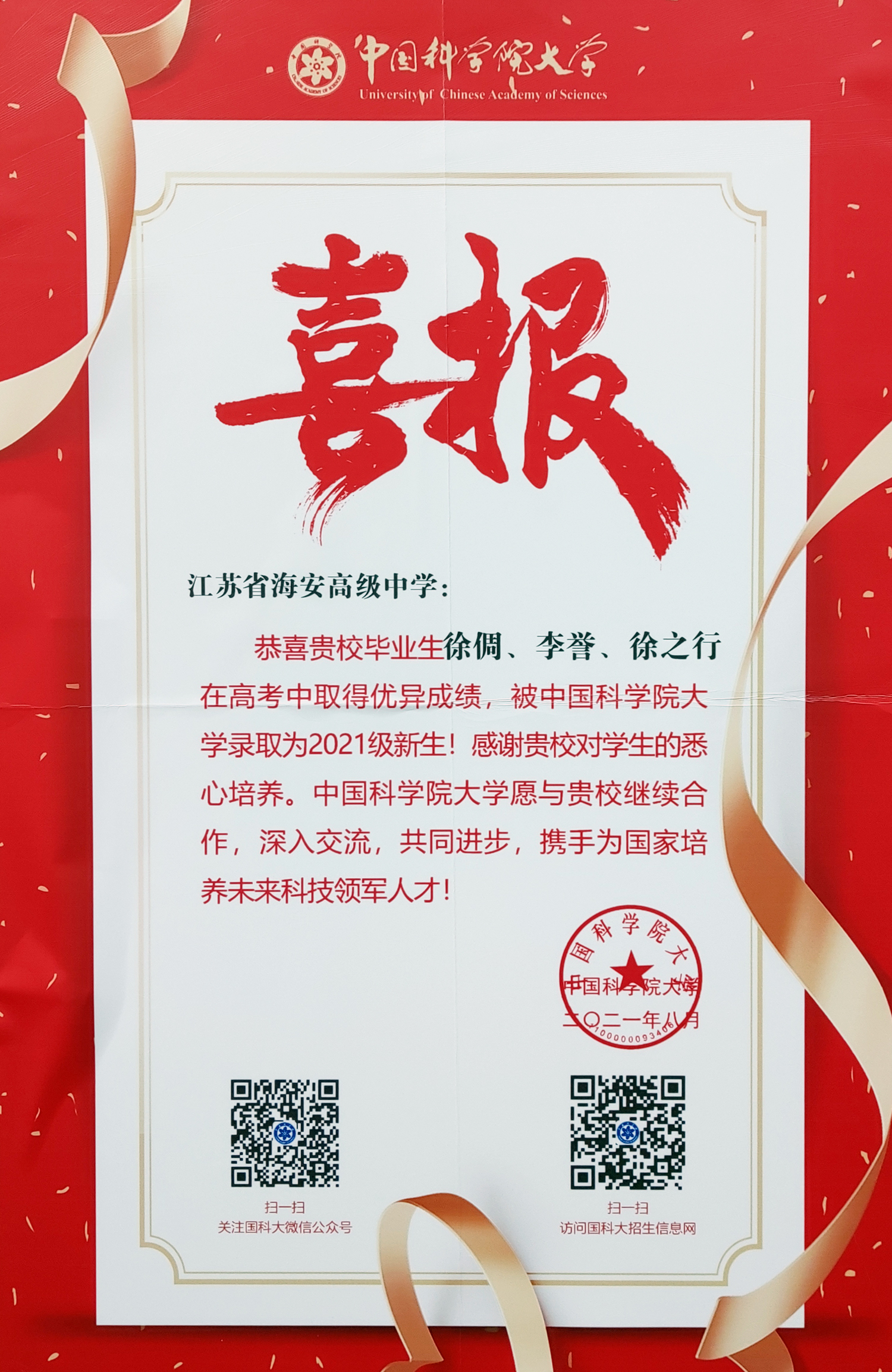 中国科学院大学向我校发来喜报 来源: 发布时间:2021-08-09 00:00:00 浏览次数: 次 【字体:小 大】 近日,中国科学院大学向我校发来喜报,祝贺我校2021届3名优秀学子考入中国科学院大学,感谢我校对学生的悉心培养,希望两校继续合作,深入交流,共同进步,携手为国家培养未来科技领军人才。希望同学们永葆探索科学奥秘的好奇心,接好科技创新的接力棒,脚踏实地,勇担使命,为国家高水平科技自立自强贡献海中力量! 分享到: 【打印正文】
