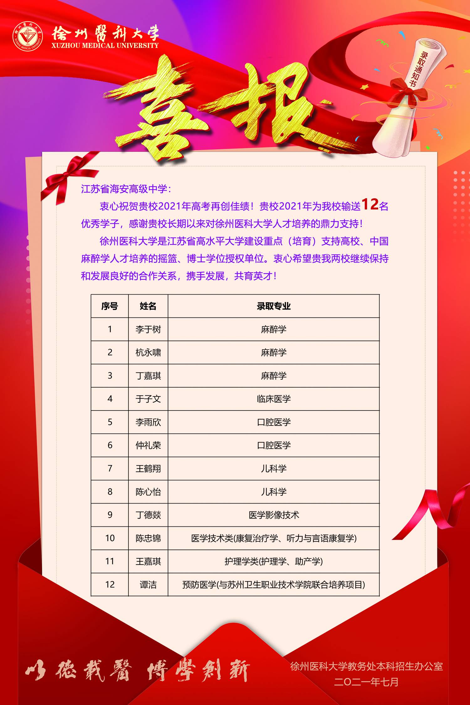 徐州医科大学向我校发来喜报 来源: 发布时间:2021-08-13 00:00:00 浏览次数: 次 【字体:小 大】 近日,徐州医科大学向我校发来喜报,祝贺我校2021届12名优秀学子考入徐州医科大学,感谢我校长期以来对徐州医科大学人才培养的鼎力支持。希望两校继续保持和发展良好的合作关系,携手发展,共育英才!向每一位选择医学的学子致敬,生命之托、重于泰山,医者仁心、人间大爱。希望同学们以坚守书不凡,用挚爱护苍生,将来在不同的工作岗位上承担救治生命的光荣职责! 分享到: 【打印正文】