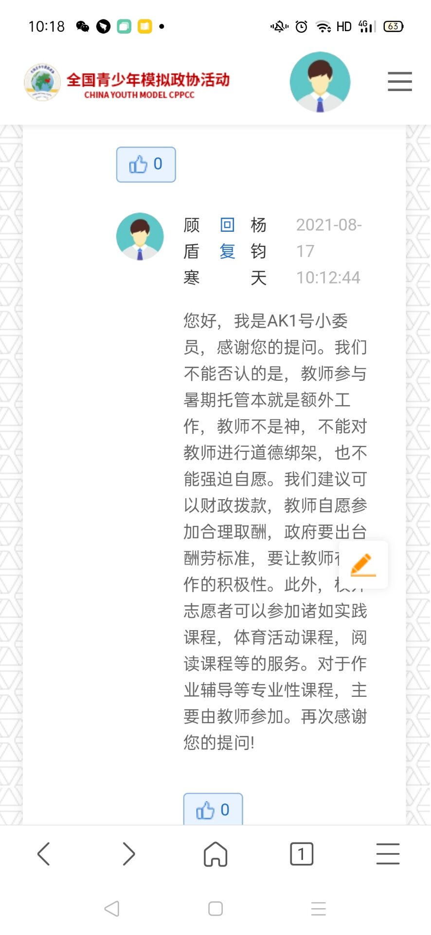 顾盾寒同学作为代表,在线上主持当天的小组活动,对其他界别小委员的提问进行详细认真的解答。