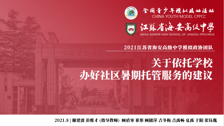 2021年8月15日至8月20日,“第八届全国青少年模拟政协活动”在“云端”举行。海安中学模拟政协小组提出的提案——《关于依托学校办好社区暑期托管服务的建议》从全国各地85所高中代表队提交提案中脱颖而出,共收获22项次团体与个人奖项,总积分位列前十。
