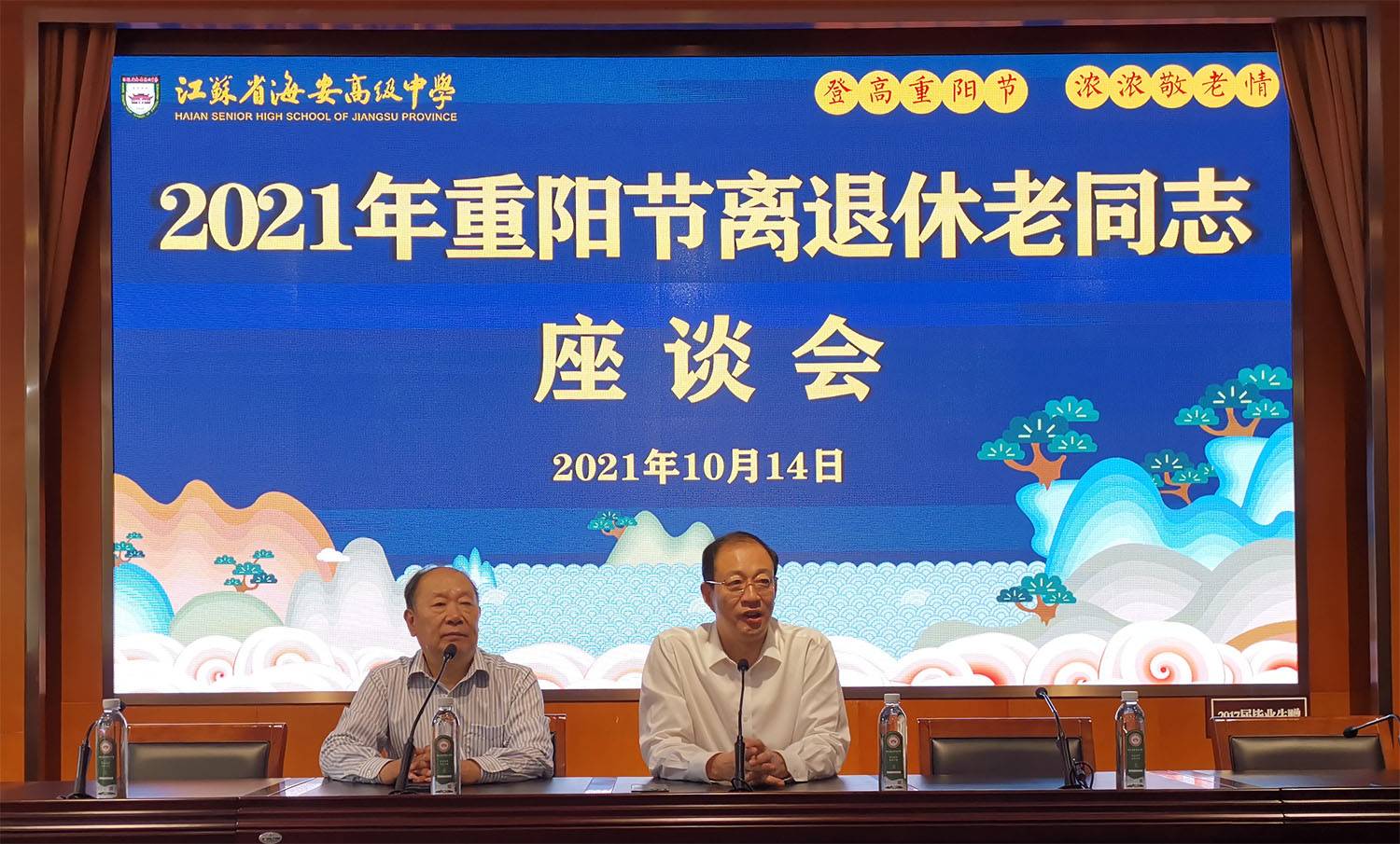 10月14日,佳节又重阳,海安中学在奥林匹克楼第一会议室举行了2021年重阳节离退休老同志座谈会。学校党委书记、校长吕建与一百余名离退休老同志共话学校事业的新发展,共度尊老爱老的重阳节。座谈会由退教协理事长吉传勇主持。