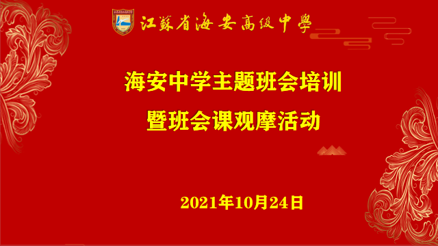 2021年10月24日晚6:40,海安中学在奥二楼博雅小剧场举行了班会课观摩活动暨班主任培训会。学校董裕华、周峰副校长,校办刘建东主任,总务处张华主任,德育处王景根主任,高一、高二各班班主任和学生代表,学生会成员观摩了此次活动。