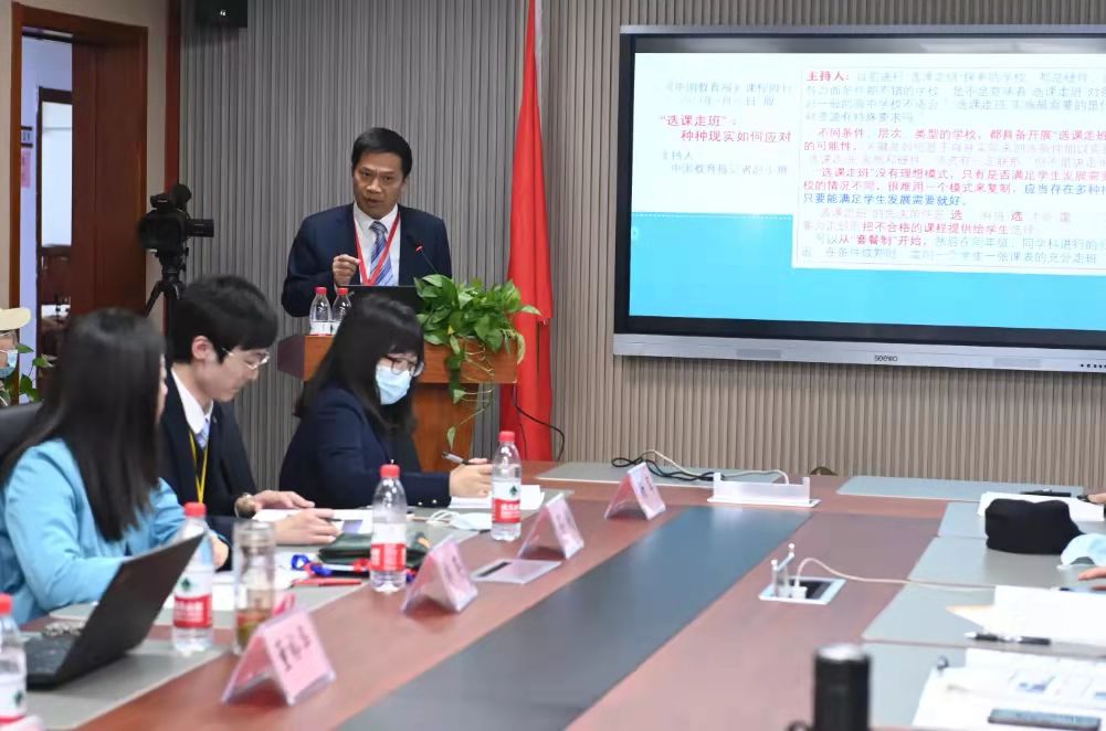 董校长在发言中指出,在新高考背景下,教学资源、设施的统筹安排,学生、教师与教学空间的合理调度,对每个新高考改革的省份学校来说,都是全新的挑战。他结合学业水平考试要求、课程设置的整体统筹等教学实际,分享了海安中学多年的实践经验,对普通高中“三新”背景下选课走班提出了建议与设想。海中选课走班,基本实现了课程分层、可选可换,既解决了学生过早纠结选科、徘徊不定的问题,又减少了相关学科教师的“潮汐现象”,并通过一系列举措提高了学校的教学管理水平和资源使用效率,构建规范有序、科学高效、切实可行的选课走班运行机制。董校长认为,要增强学生学习的选择性,“选”是重要的,但更重要的还是“试”,一定要让学生有更多尝试的机会,让学生在尝试、调整、再尝试、再调整的过程中,实现自我认识、自我接纳、自我发展,从而达到自我满意。