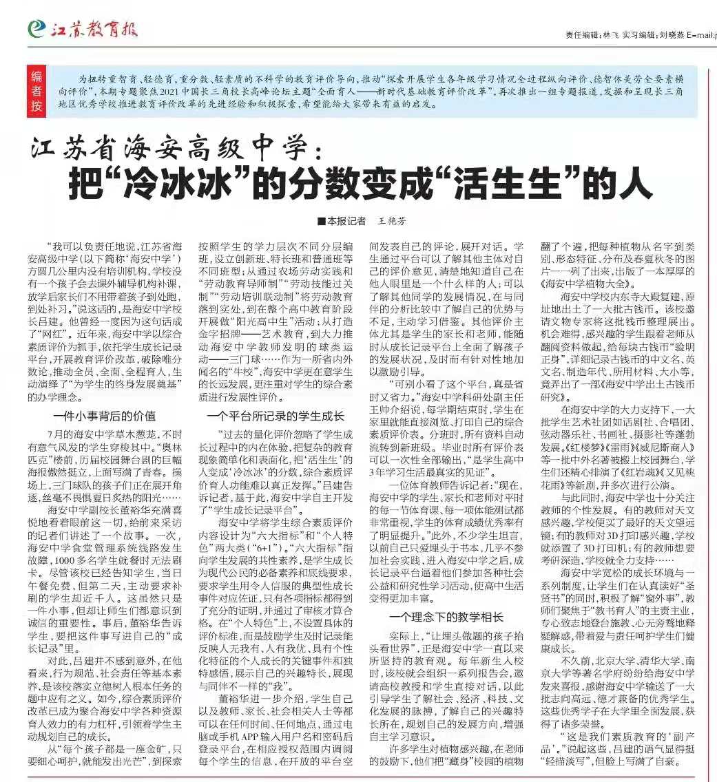 ▲《江苏教育报》专题报道《把“冷冰冰”的分数变成“活生生”的人》