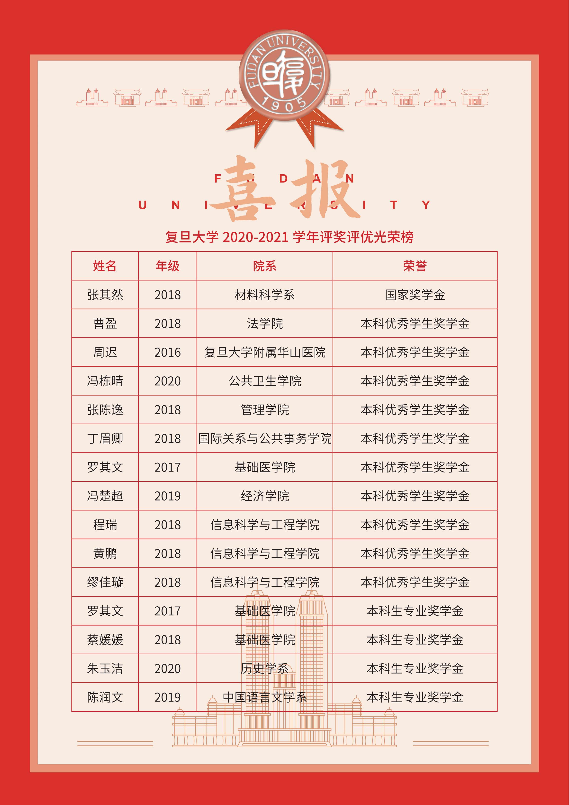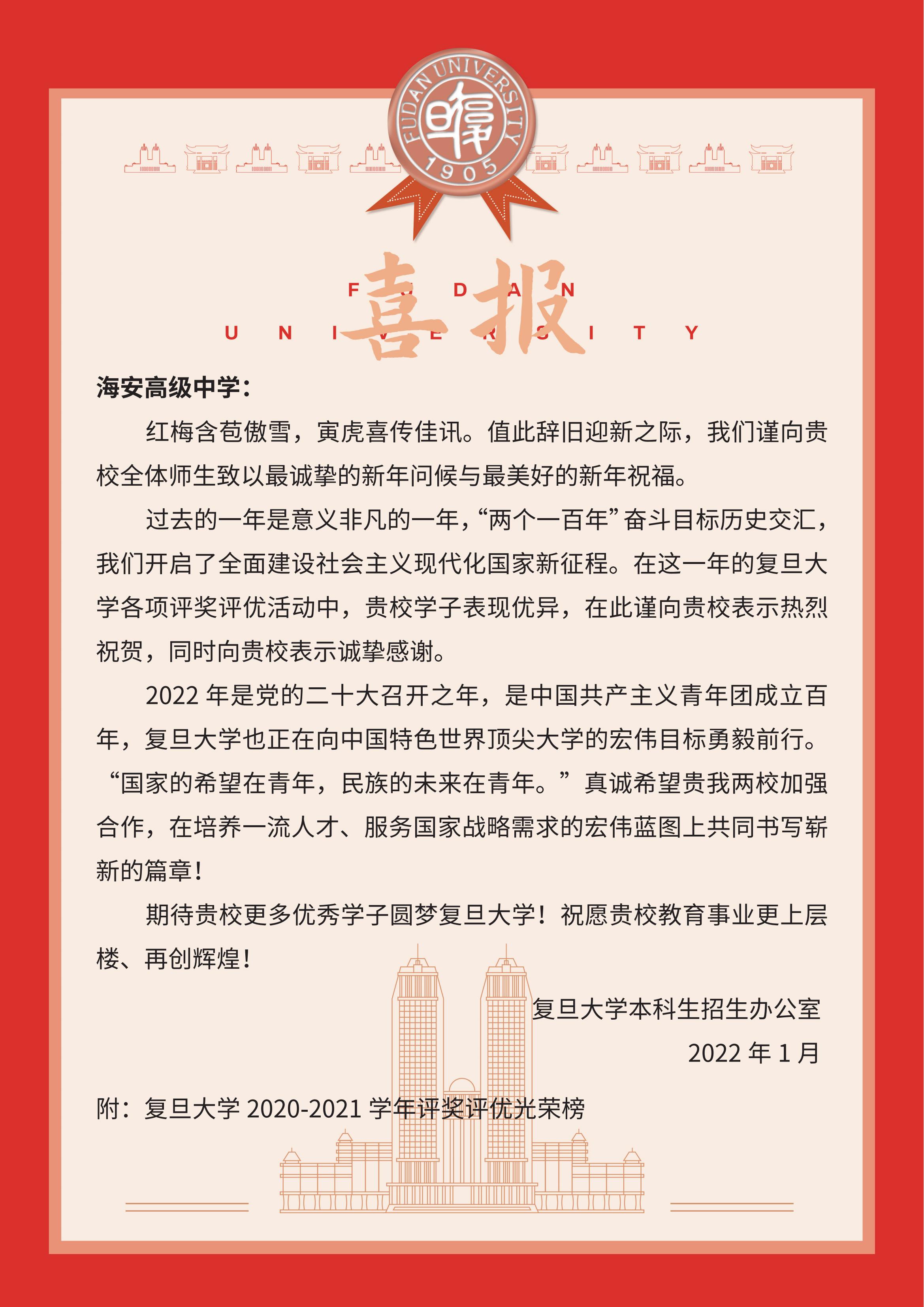 复旦大学向我校发来喜报 来源:校长办公室 发布时间:2022-01-13 00:00:00 浏览次数: 次 【字体:小 大】 红梅含苞傲雪,寅虎喜传佳讯!辞旧迎新之际我校收到来自复旦大学的喜报在2020-2021学年海中校友获复旦大学各类奖学金共计15人次向获奖同学表示祝贺!期待更多的海中人拼搏奋进,再创佳绩! 分享到: 【打印正文】