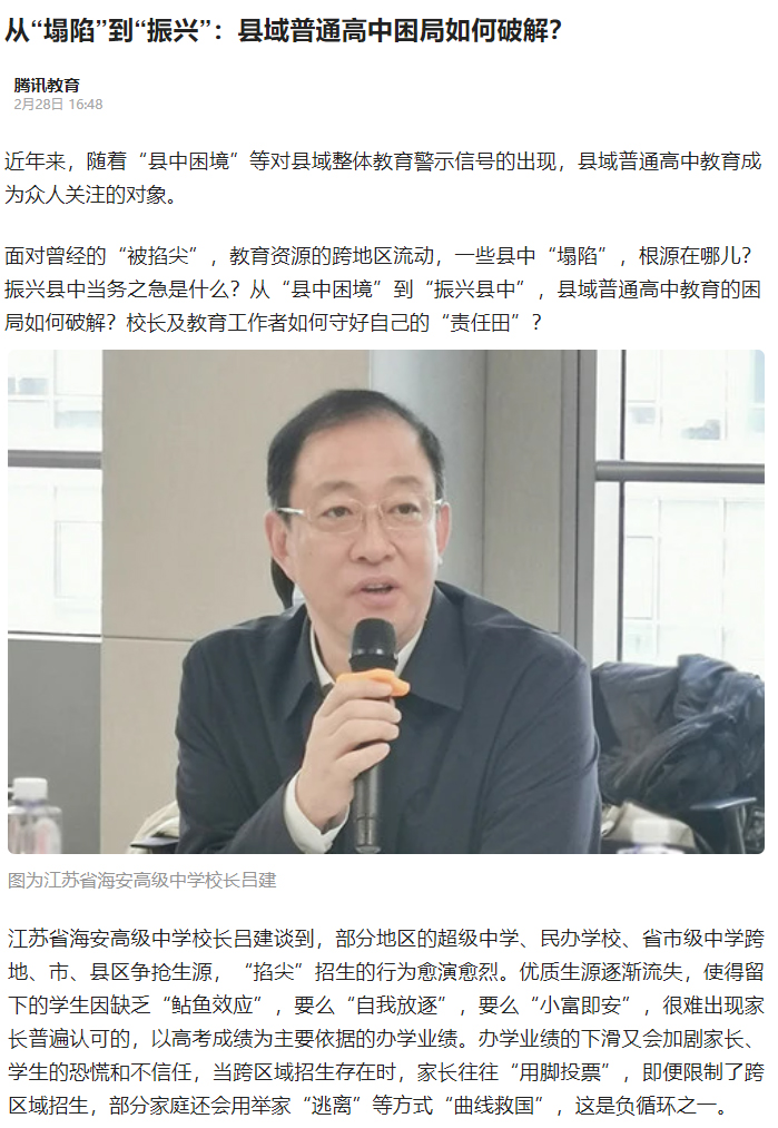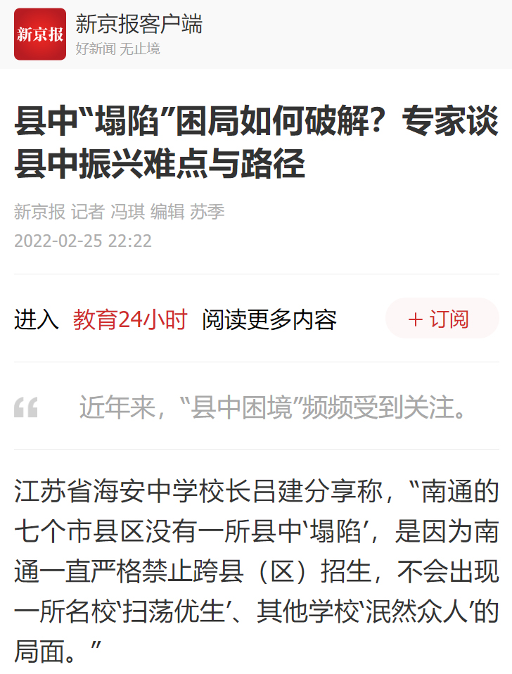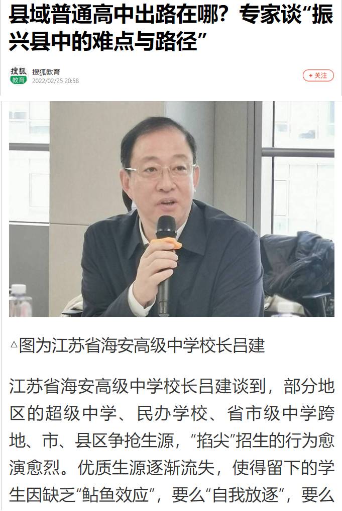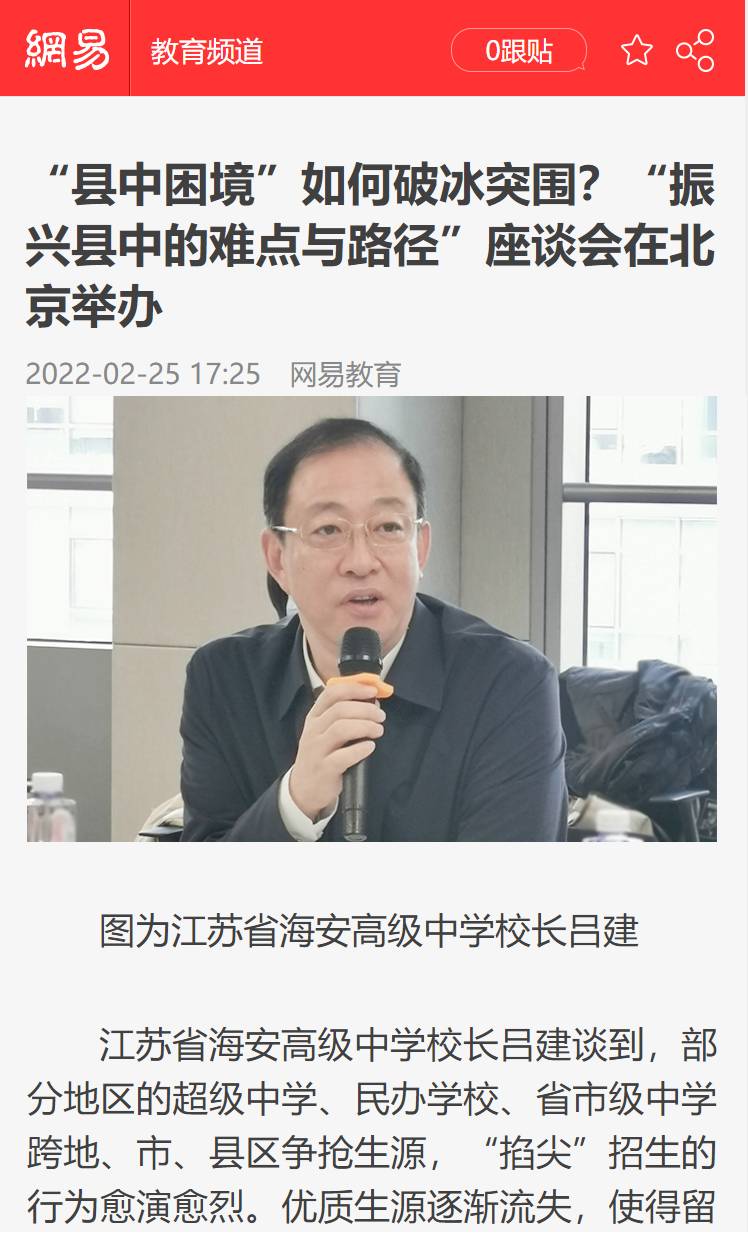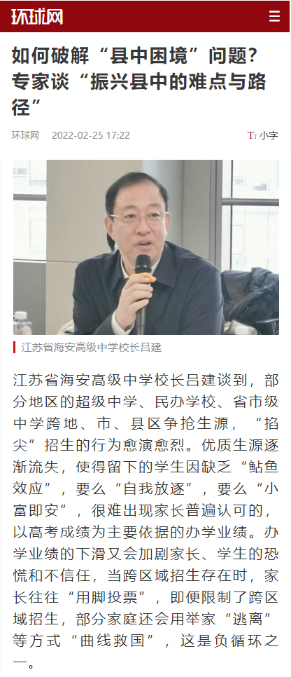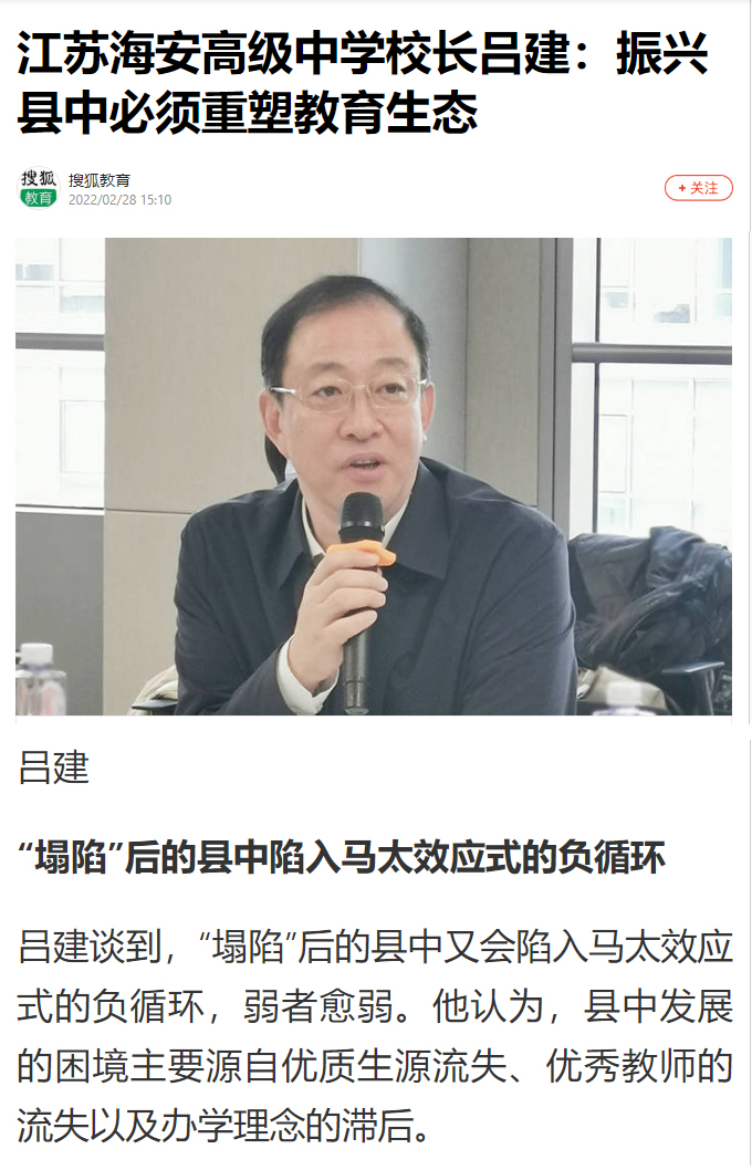 2月25日,海安中学党委书记、校长吕建应邀出席由中国教育三十人论坛、北京师范大学中国教育政策研究院和博鳌教育论坛联合主办的“振兴县中的难点与路径”座谈会。座谈会上,吕建校长以《振兴县中必须重塑教育生态》为题,剖析了县中的衰落乃至“坍塌”的核心因素,并以南通、海安地区及海安中学教育高质量发展实践为例,提出破解之道,引发广泛的社会反响,新京报、21财经、澎湃新闻、界面新闻、搜狐、腾讯、新浪、网易、中国网、环球网、今日头条、现代教育报、南方周末、光明网等各大主流媒体纷纷报道海中的成功实践。
