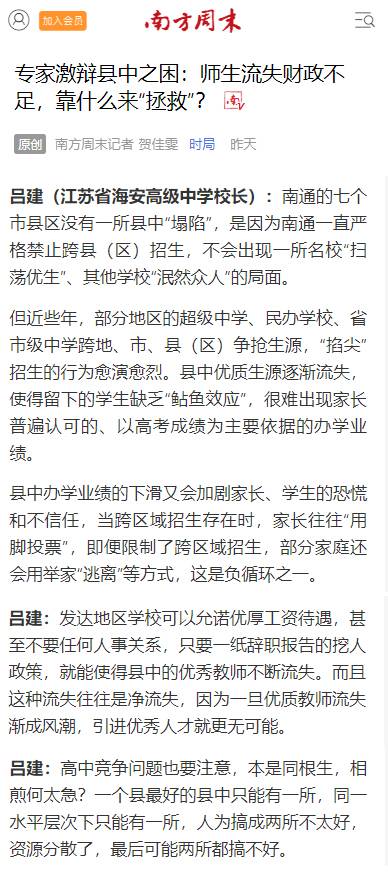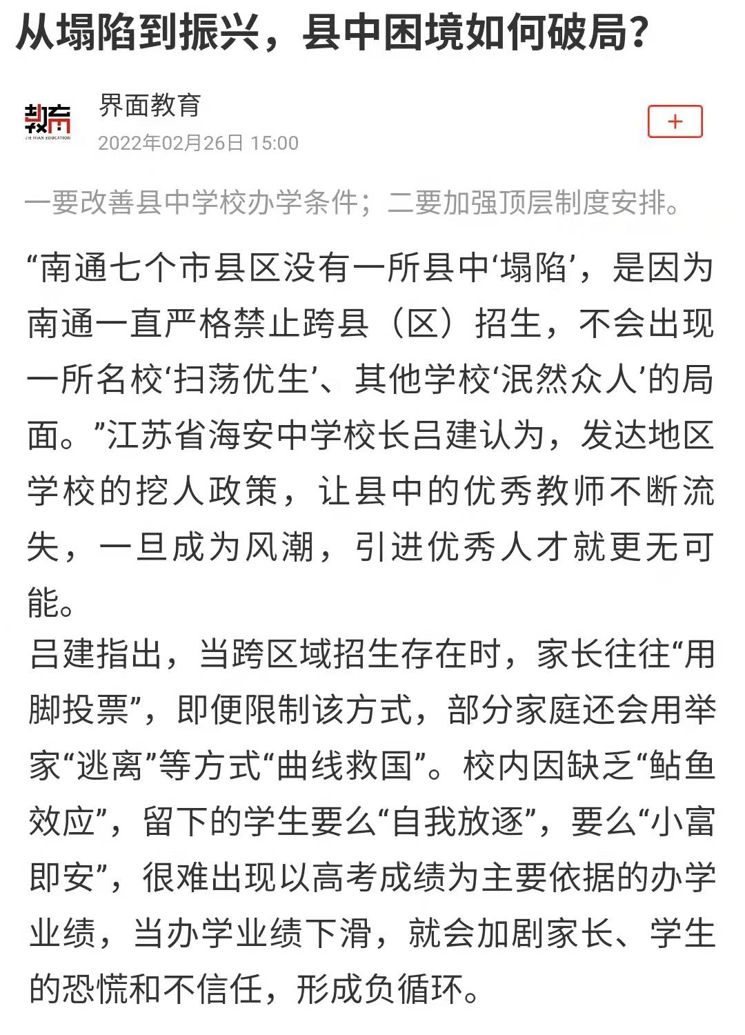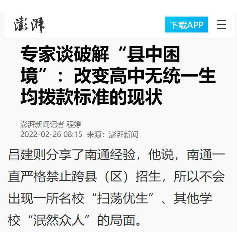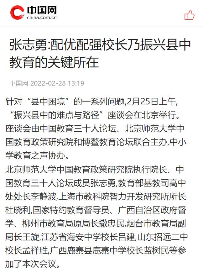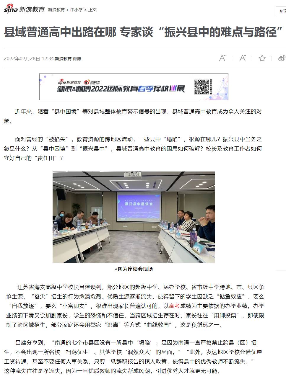 2月25日,海安中学党委书记、校长吕建应邀出席由中国教育三十人论坛、北京师范大学中国教育政策研究院和博鳌教育论坛联合主办的“振兴县中的难点与路径”座谈会。座谈会上,吕建校长以《振兴县中必须重塑教育生态》为题,剖析了县中的衰落乃至“坍塌”的核心因素,并以南通、海安地区及海安中学教育高质量发展实践为例,提出破解之道,引发广泛的社会反响,新京报、21财经、澎湃新闻、界面新闻、搜狐、腾讯、新浪、网易、中国网、环球网、今日头条、现代教育报、南方周末、光明网等各大主流媒体纷纷报道海中的成功实践。