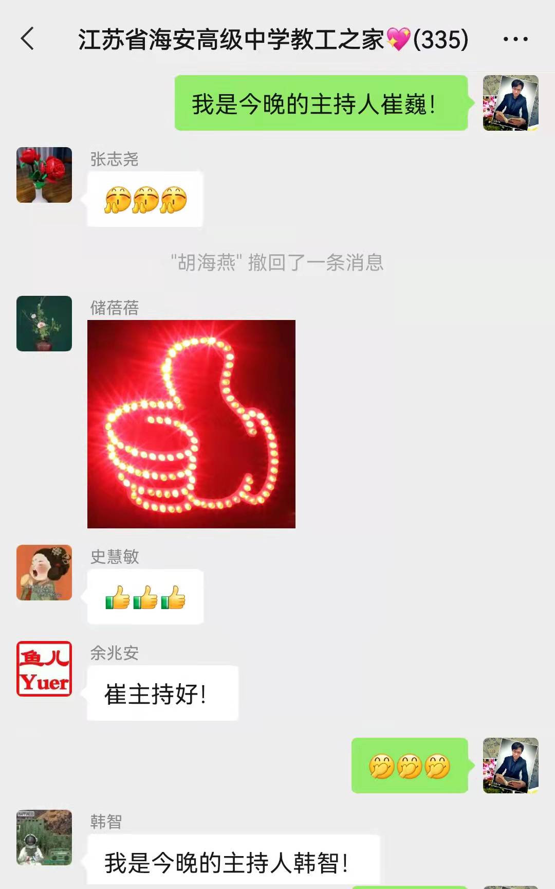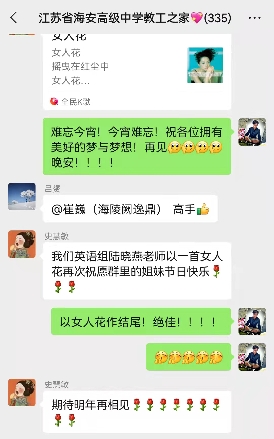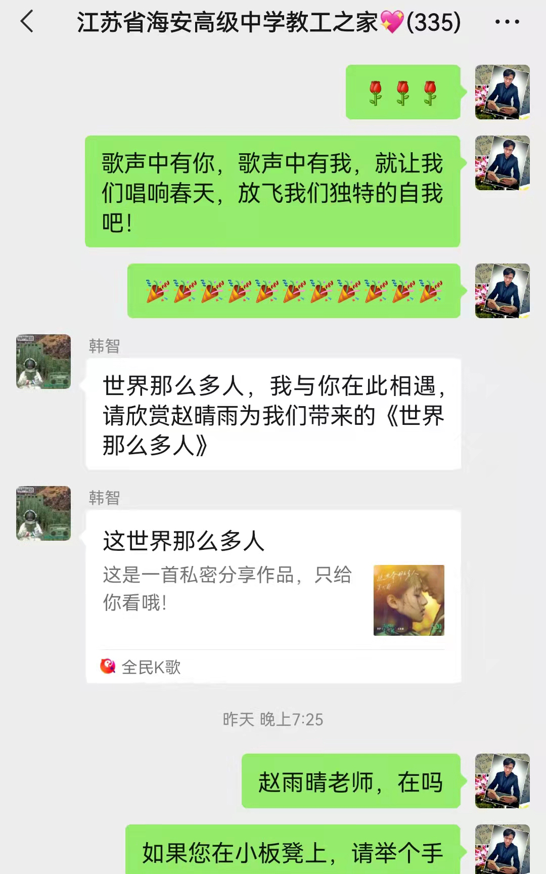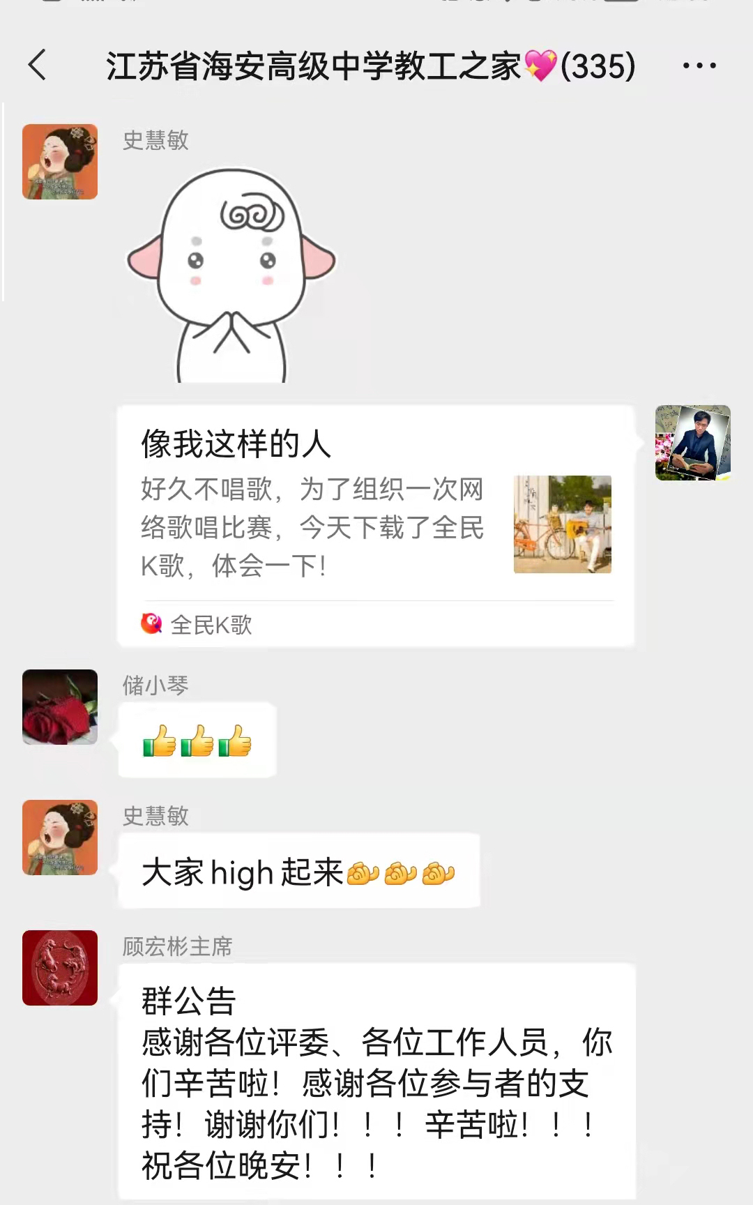 3月8日晚七点,海安中学以网上工会为支点,通过“9323彩集团教工之家”微信群为活动阵地,举办了一次历时三个半小时的网络歌唱比赛。本次活动选手统一使用K歌APP录制歌曲,有独唱,有合唱,共31名教职工激情演绎了27首歌曲。活动中,微信群中热火朝天,讨论、赞叹、喝彩、鼓掌不断刷屏。主持人幽默机智,合理引导着比赛进程和节奏,至晚十点半,仍有下了晚自修的老师们积极发送来歌曲参赛。