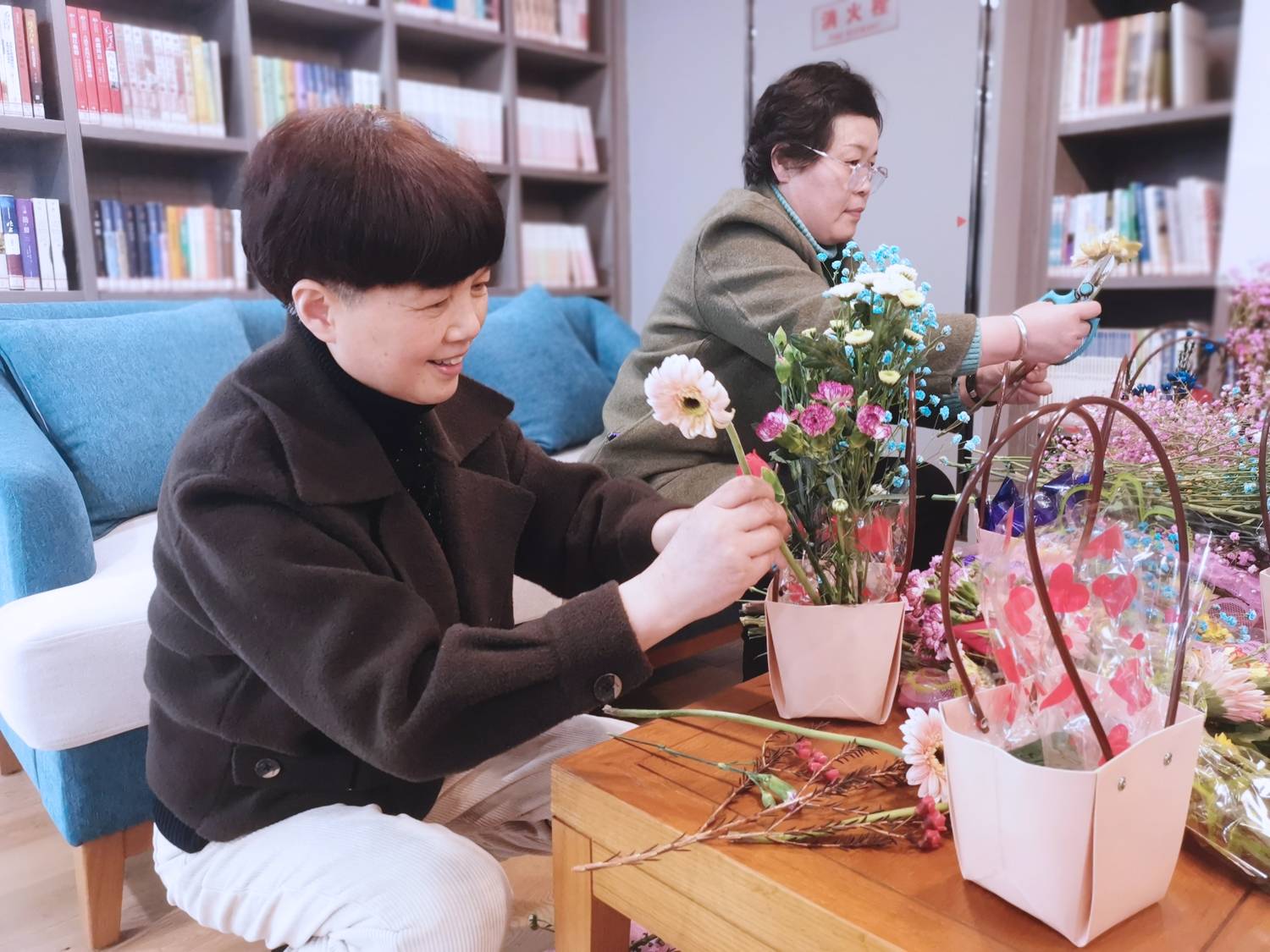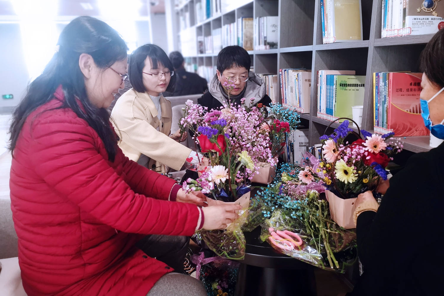 3月8日下午,女教职工们从工作的间隙中抽出时间,来到学校图文信息中心图书馆咖啡茶座参加“咖啡茶歇读书插花沙龙”,茶座工作人员为参加活动的女同志们奉上香浓的现磨咖啡,合作单位的糕点师和花艺师准备好了各色西点和鲜花。同志们一边品尝咖啡、西点,一边自己动手,在花艺师的指导下体验插花艺术。大家边聊边根据自己的喜好制作花篮,每个人都徜徉在愉悦的氛围中。鲜花映衬着笑脸,书香交融着茶香,此时有喜乐、有宁远,有诗,有春天。