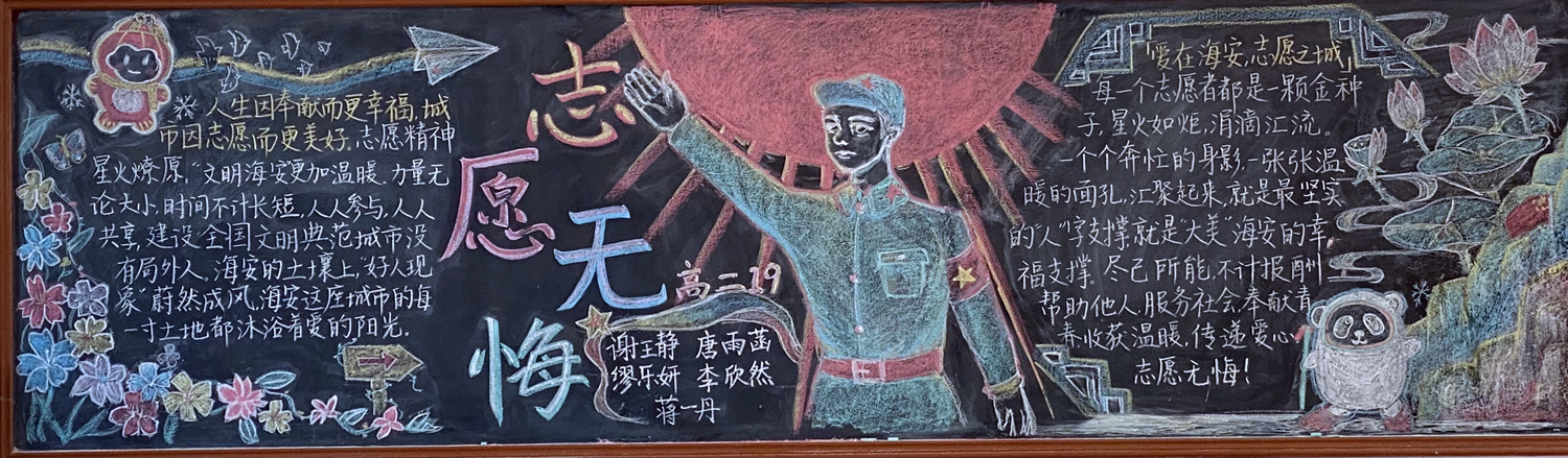 人间真情,大爱无疆。通过这期黑板报的策划,我们深刻领悟到了志愿精神的崇高;在出黑板报的过程中,也体会到了团结互助的力量。这汩汩暖流与无私,为我们注入了不可忘却的时代强音!很感谢学校和老师能够给我们一次这样的机会,使我们的综合能力得到锻炼,收获颇丰。