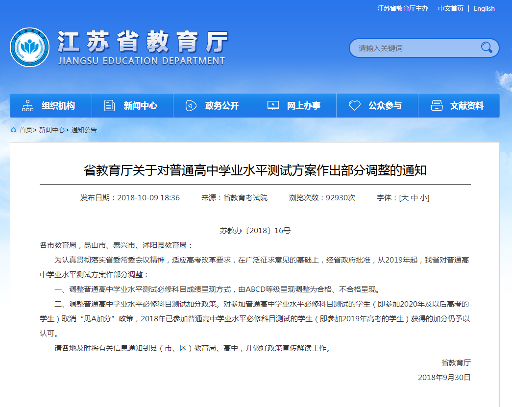 二、调整普通高中学业水平必修科目测试加分政策。对参加普通高中学业水平必修科目测试的学生(即参加2020年及以后高考的学生)取消“见A加分”政策,2018年已参加普通高中学业水平必修科目测试的学生(即参加2019年高考的学生)获得的加分仍予以认可。