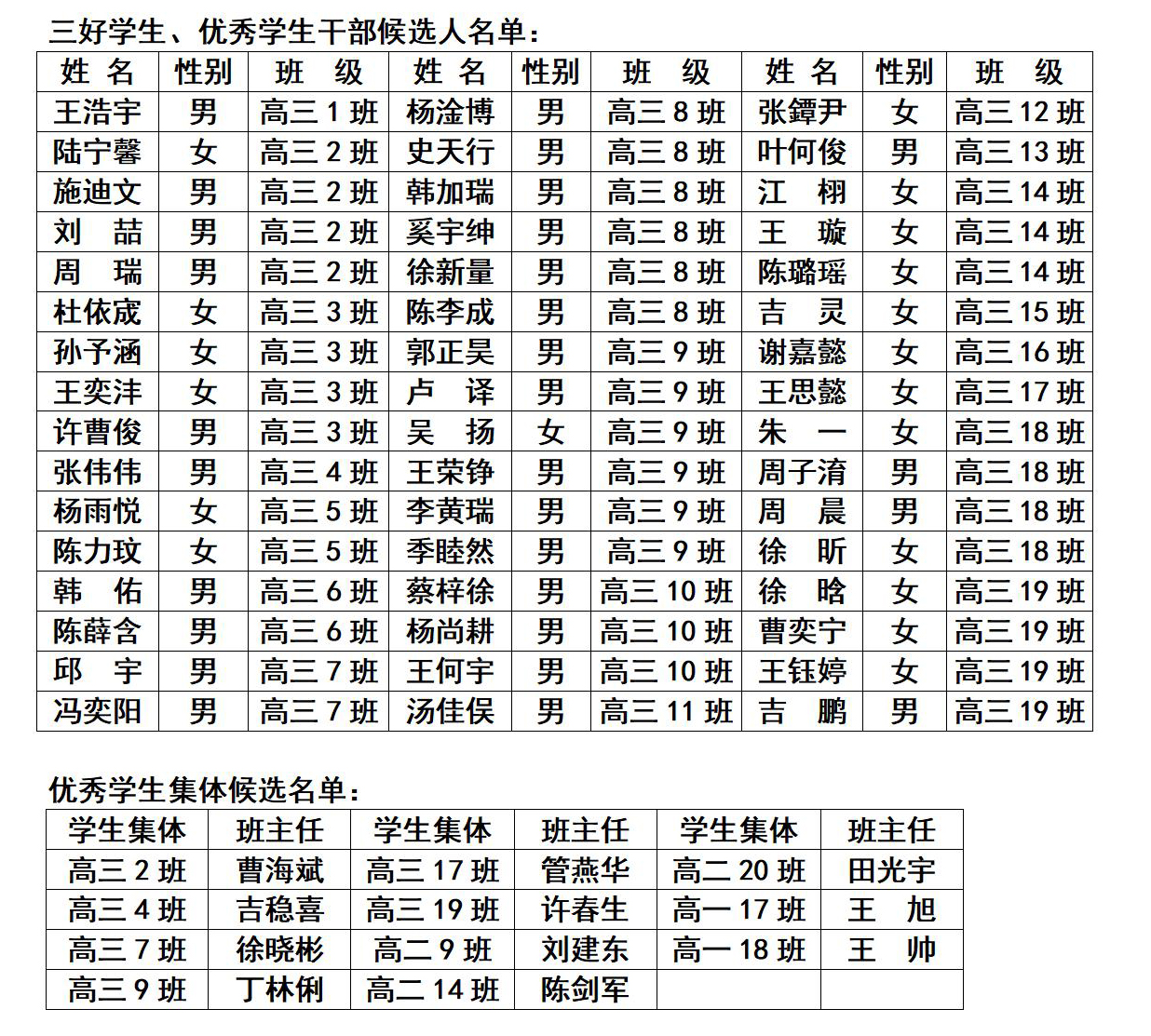 公示 来源:德育处 发布时间:2022-03-23 00:00:00 浏览次数: 次 【字体:小 大】 根据省、市评选2022年度三好学生、优秀学生干部和优秀学生集体的通知精神,经由班级推荐、任课教师和年级组评议、党政联席会议审核,拟推荐下列同学和班级为2022年度江苏省、南通市、海安市三好学生、优秀学生干部和南通市、海安市优秀学生集体。特此公示。公示时间为3月23日- 3月28日。 江苏省海安高级中学2022年3月23日 分享到: 【打印正文】