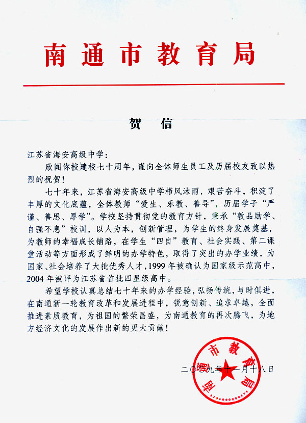 南通市教育局贺我校七十华诞