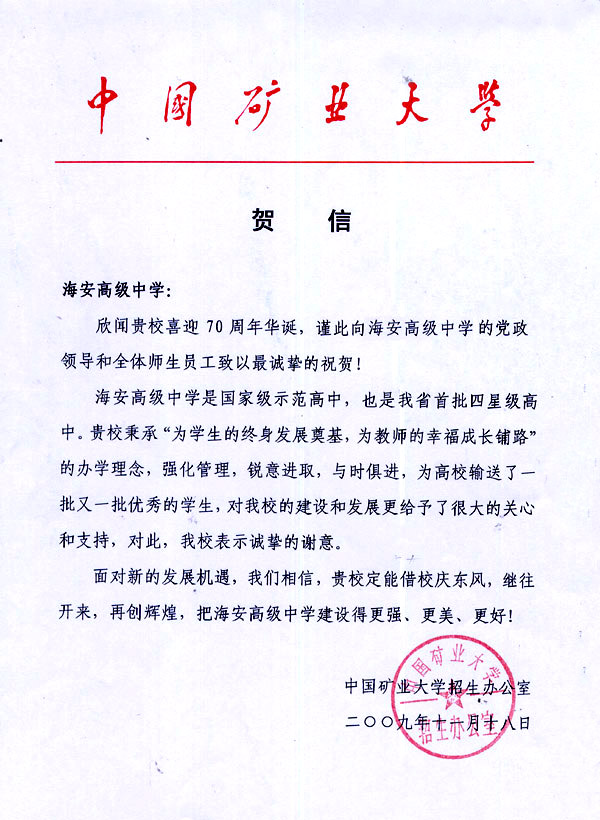 中国矿业大学贺我校七十华诞
